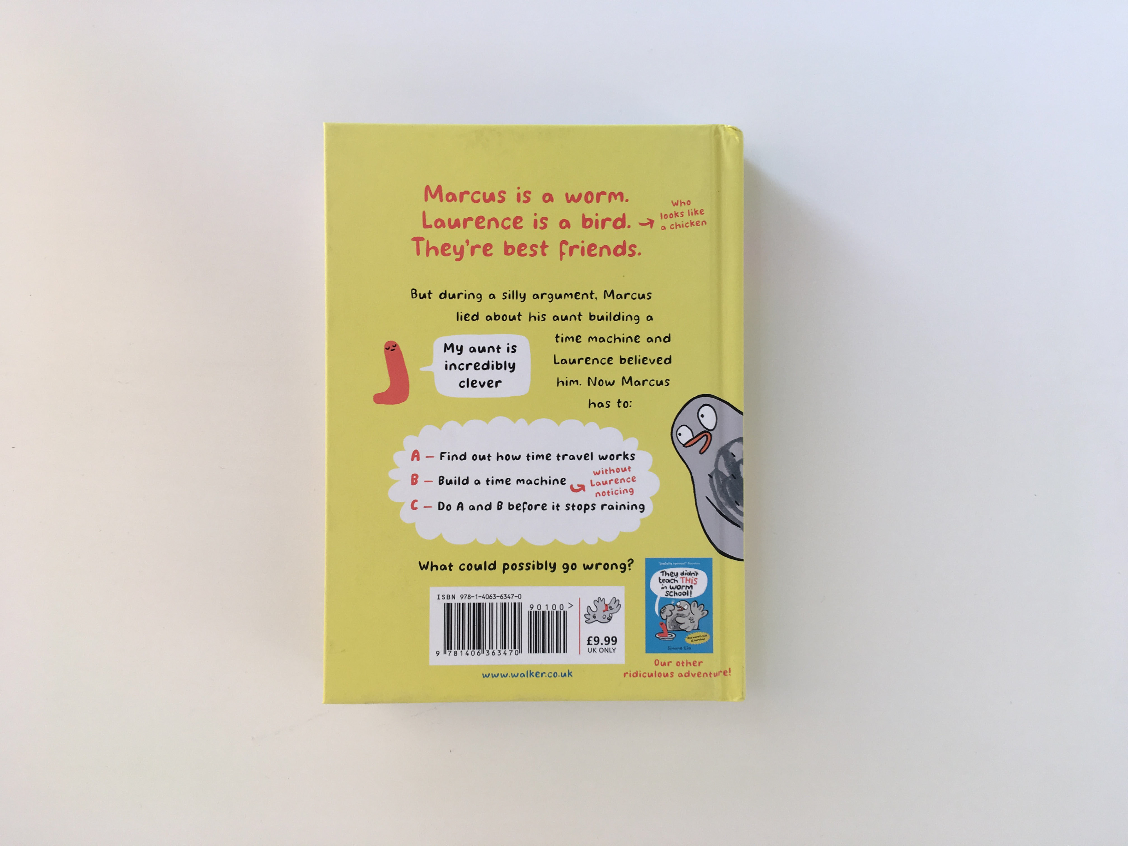 Marcus is a worm. Laurence is a bird (who looks like a chicken). They're the best of friends. But during a silly argument, Marcus lied about his aunt building a time machine and Laurence believed him. Now Marcus has to: A – Find out how time travel works B – Build a time machine C – Do A and B before it stops raining What could possibly go wrong? Published October 2019 (Walker Books) this is the sequel to Simone Lia's acclaimed "They Didn't Teach THAT in Worm School!" with praise such as "Laugh-out-loud and full of wonderfully funny illustrations ... a must-read for anyone with a sense of adventure" ... Red Reading Hub
